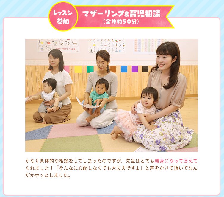 体験レッスン中や終了後に、子どもの様子を見て具体的なアドバイスをもらえたり、育児の悩み相談に乗ってもらえたりする点が好評です。