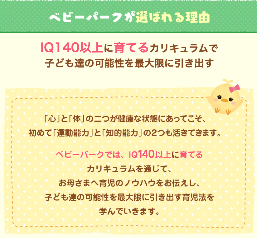 ベビーパークは、「親が学ぶ」という独自のスタイルと、脳科学に基づいた早期教育プログラムで、多くの親子に支持されている幼児教室です。
