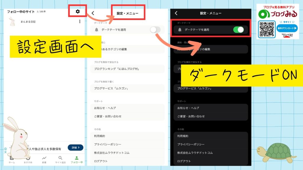 「ブログみる」はダークモードに対応しているので、夜間の閲覧や長時間のブログチェックも快適に行えます。