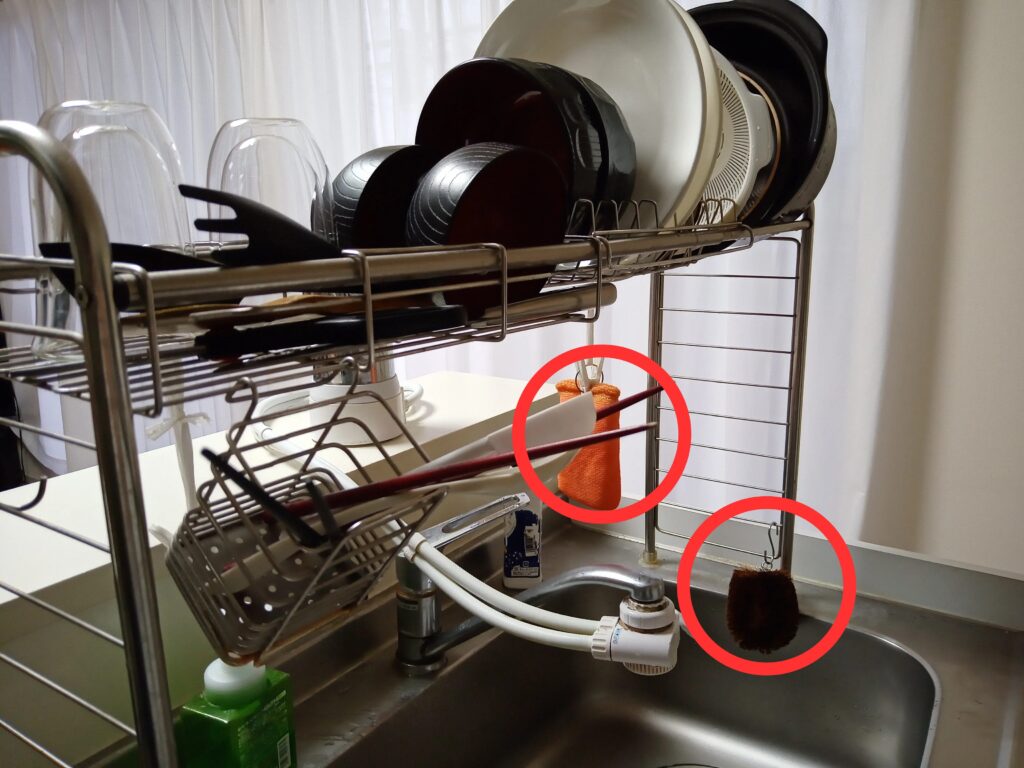 スポンジやたわしもシンク内側に引っ掛けるようにして、水がシンクに直接落ちるように工夫。