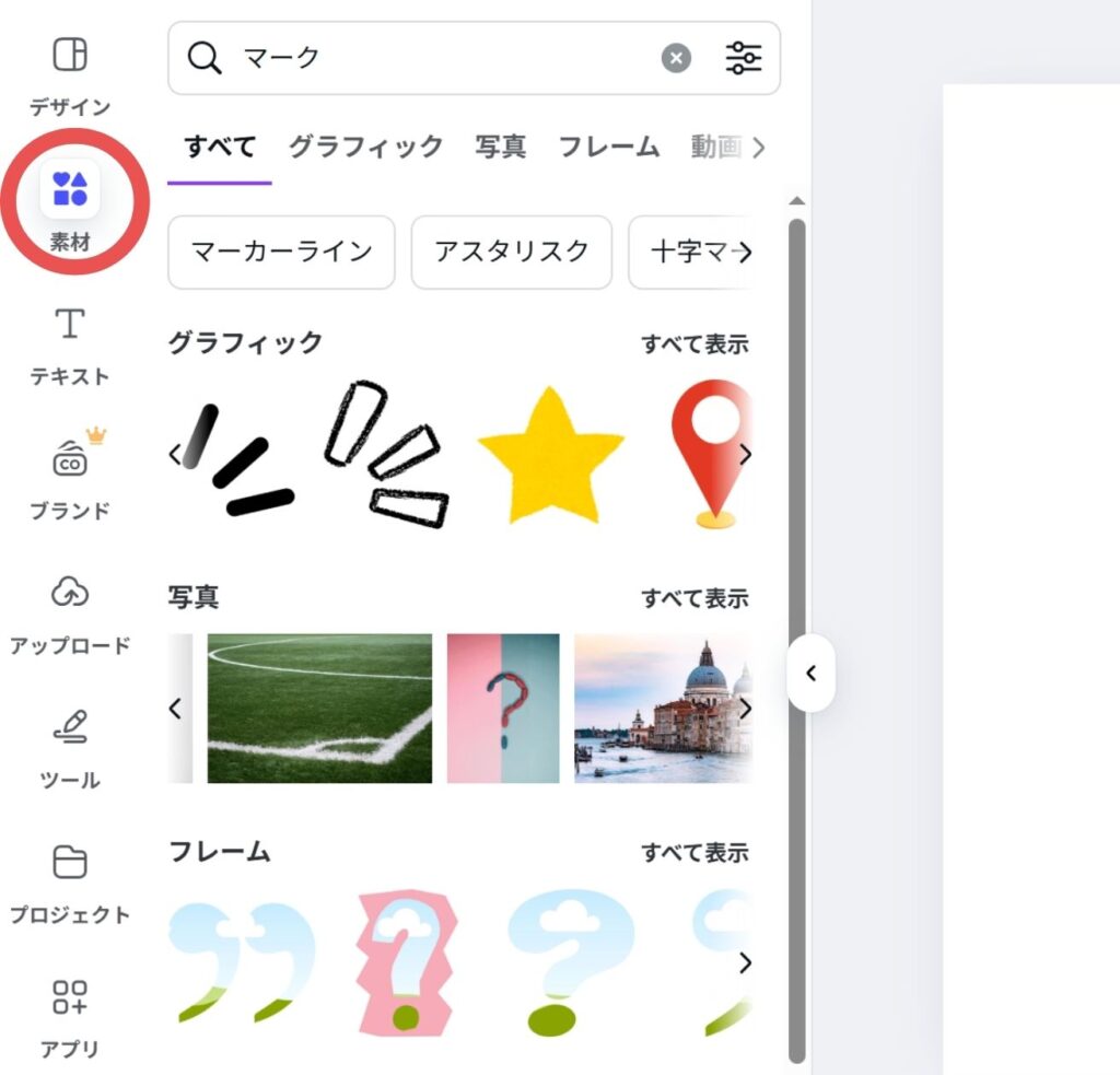 使い方は簡単で、左側の”素材”から検索して、”グラフィック”や”写真”からイメージに合う素材を選択するだけです。