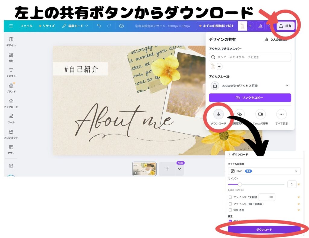 文字や画像を自分のブログように修正したら、左上の”共有”ボタンからダウンロード