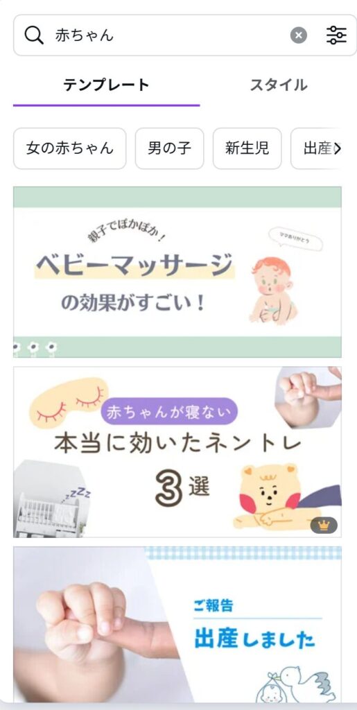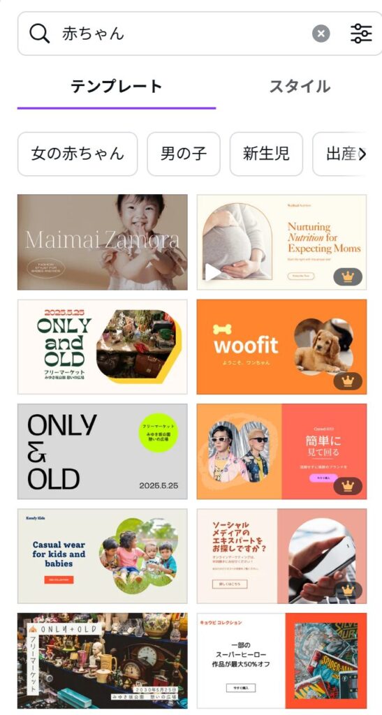実際に”Webサイト”テーマと”note記事見出し画像”テーマでそれぞれ”赤ちゃん”というテンプレートを検索した結果が以下です。