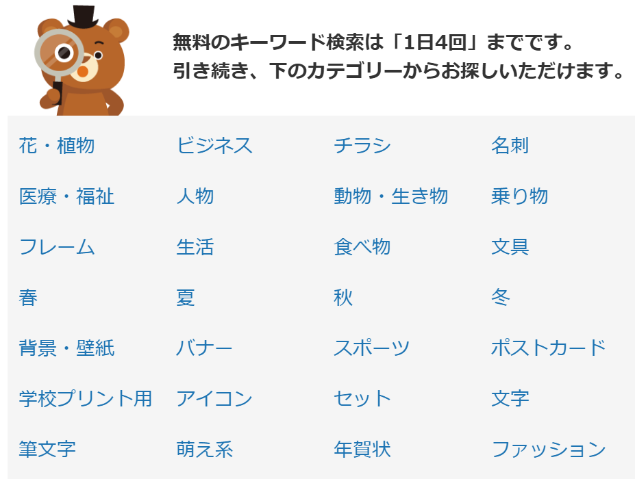 検索結果からフォトACやイラストACのページに飛べば、検索回数制限の影響を受けず、実質無制限で素材を探すことが可能になります。