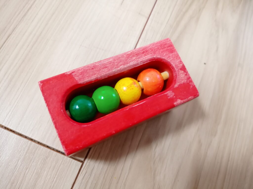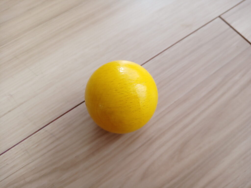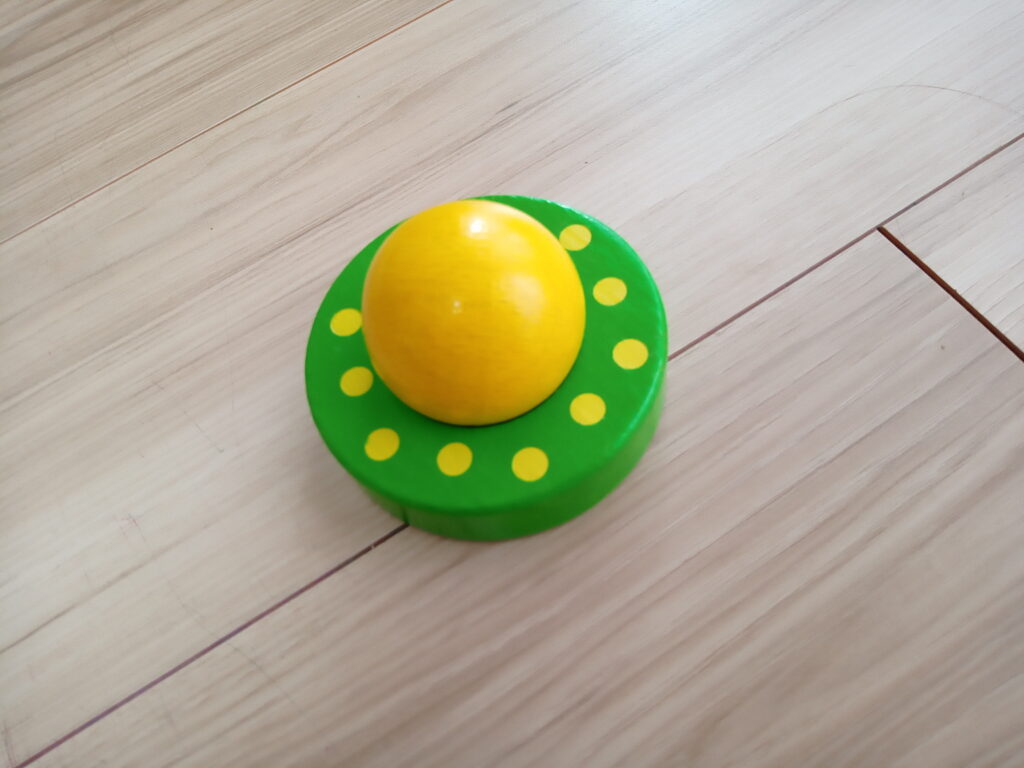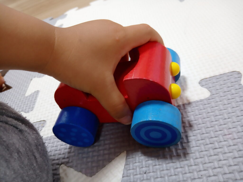 赤ちゃんの手にぴったりのサイズ感で、積み木の上に乗せたり、口に入れたり(汗)と、とにかくお気に入り。