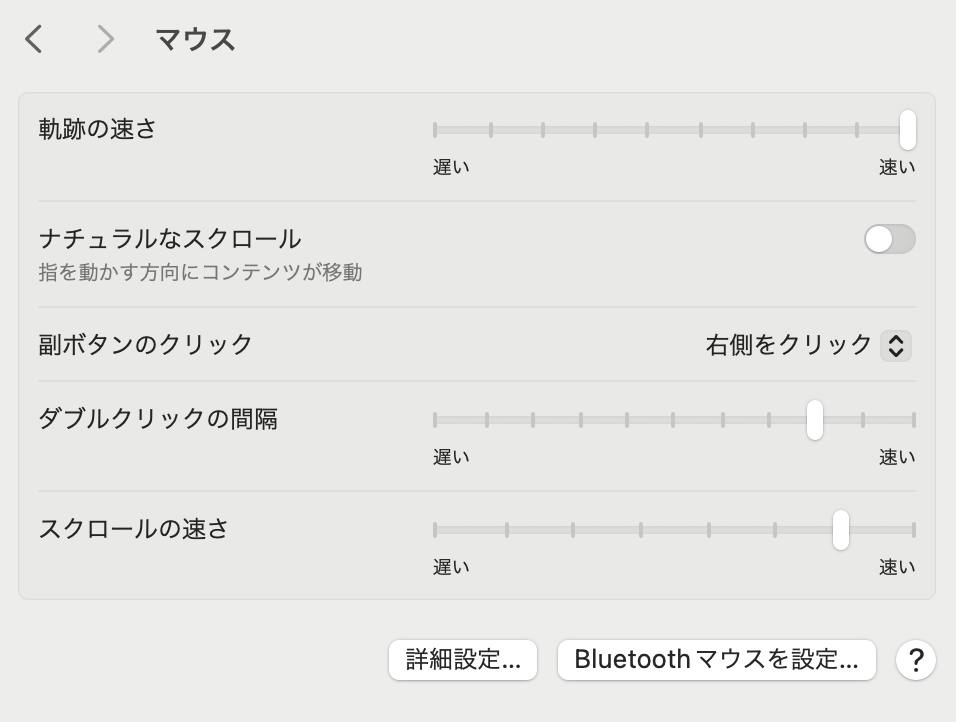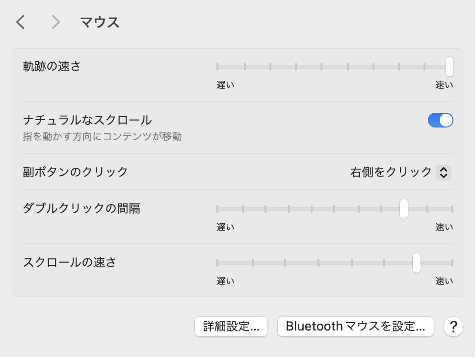 トラックパッドの設定と同様に、次はマウスの設定状態を確認してみましょう。