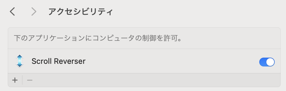 「アクセシビリティの許可をリクエストする」を押すと、設定アプリの「アクセシビリティ」が表示されるので、「Scroll Reverser」をONの状態にします。