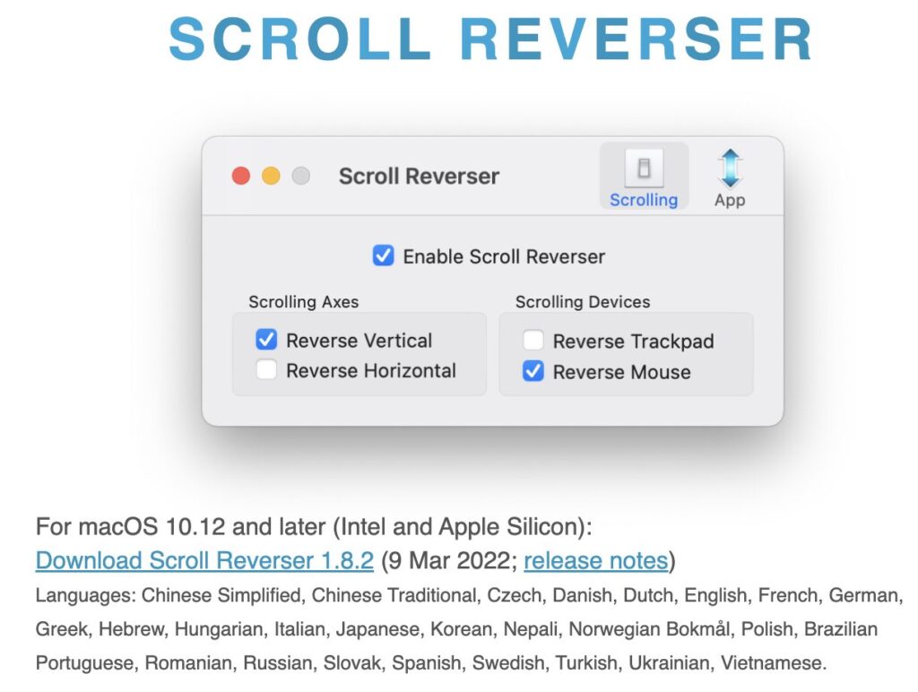「SCROLL REVERSER」をmacにインストールし、所定の設定をするだけで上述の悩みから開放されます。