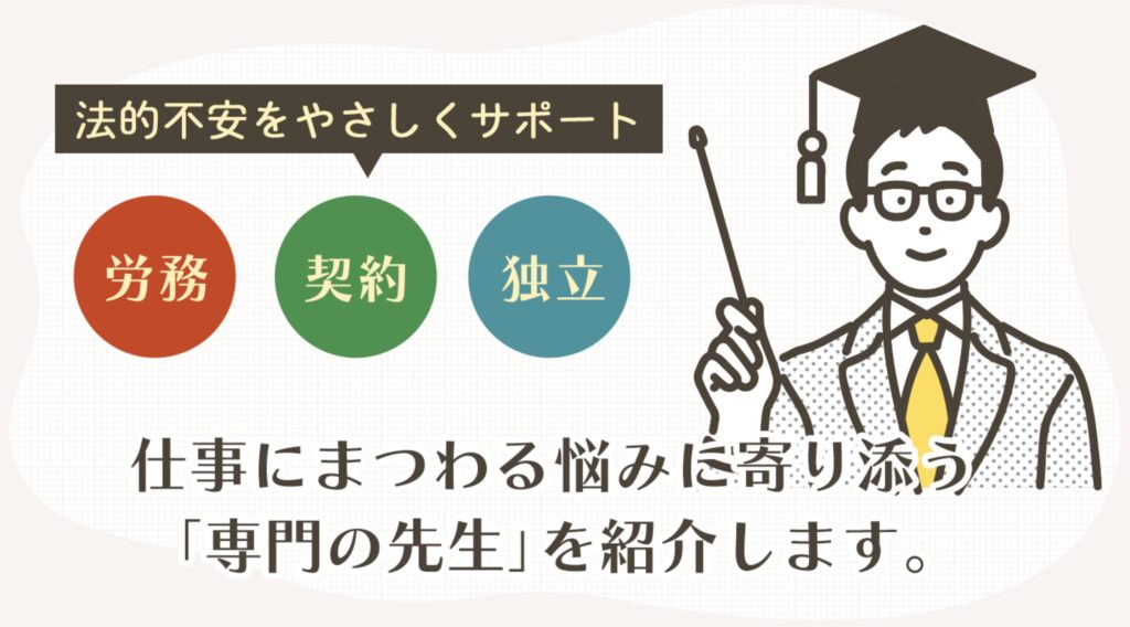 仕事にまつわる悩みに寄り添う「専門の先生」を紹介。労務・契約・独立など働く人の法的不安をやさしくサポート。