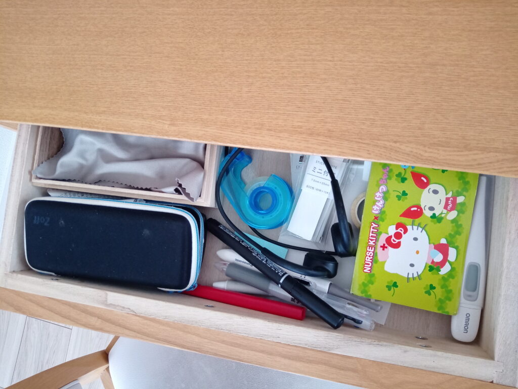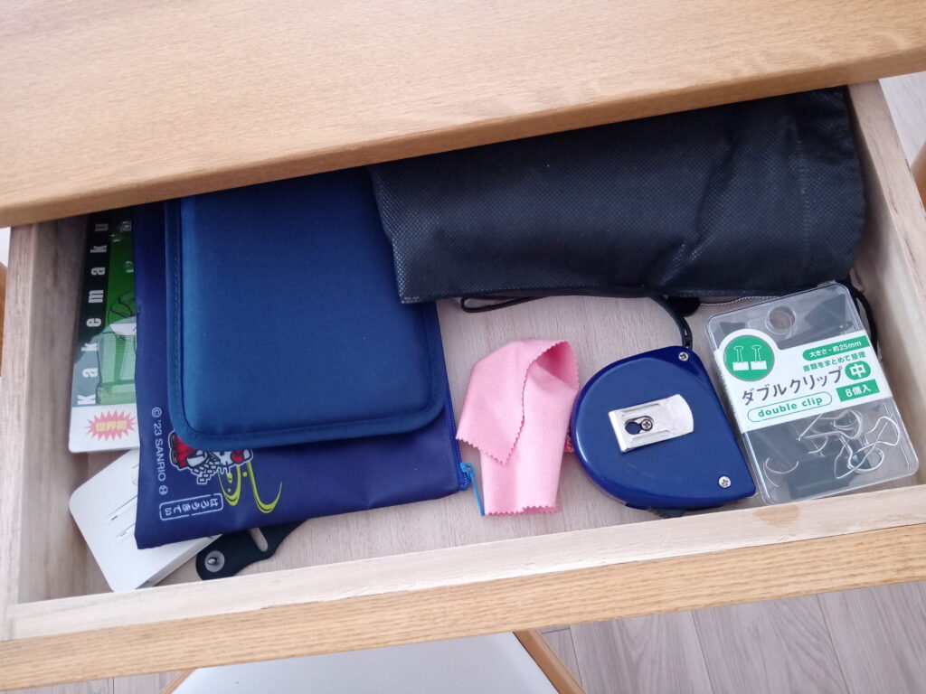 出しっぱなしになりがちな文房具や日用品をサッとしまえるので、テーブルの上がいつもスッキリ保てます。