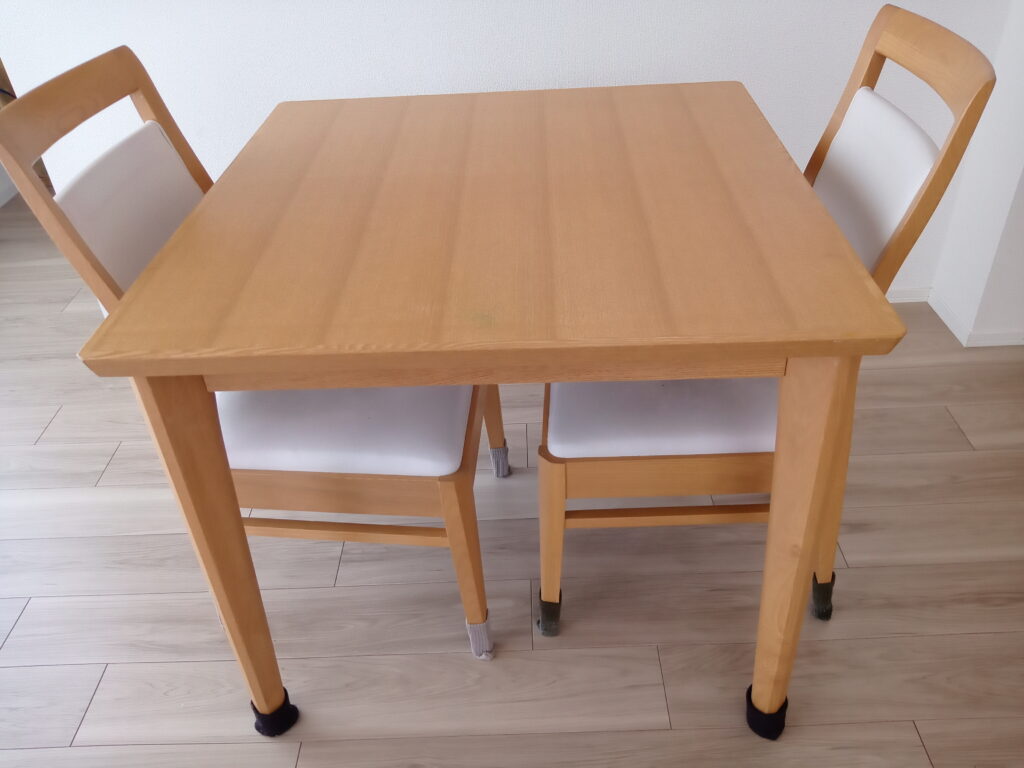 テーブルや椅子の脚には、あらかじめフェルト等はついていないので、床を保護するのに椅子脚キャップや靴下をつけておくと◎。